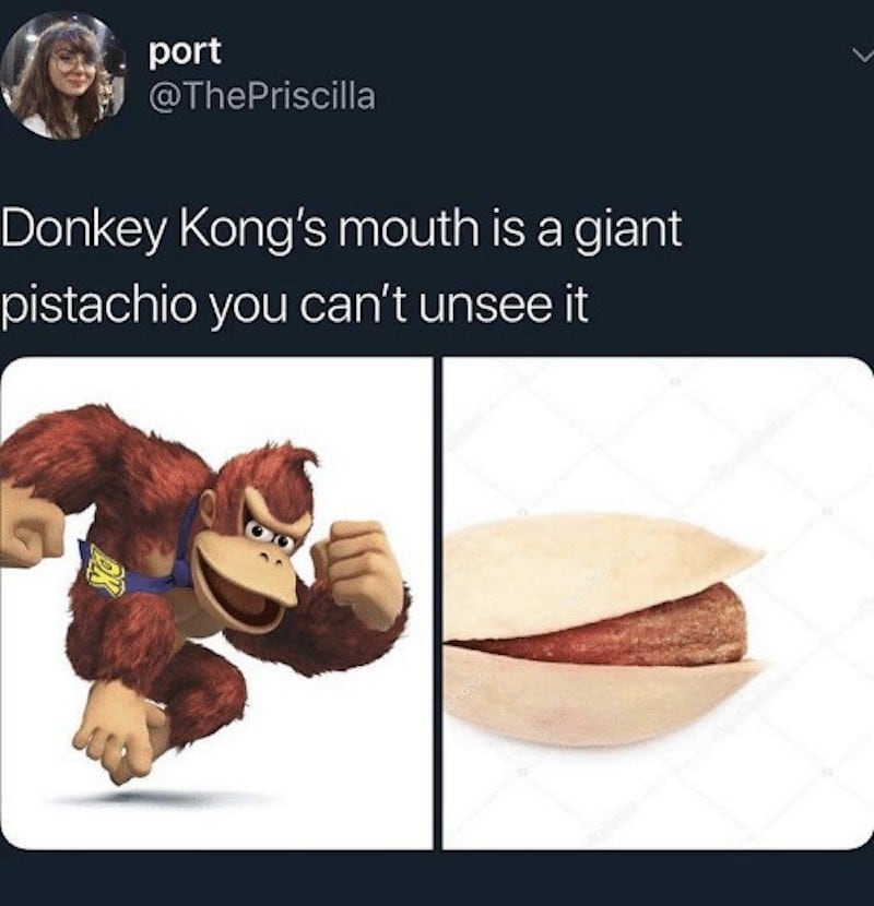 People have analyzed Donkey Kong in every perceivable way throughout his tenure as a Nintendo figure. However, it was only recently that someone discovered that the mouth on a 3D render of DK looks sort of like a pistachio. You’d think the designers would’ve wanted to put a banana in there somewhere because, you know, he’s a gorilla.